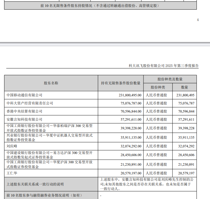 科大讯飞2025年三季报显示,中国移动通信有限公司、中科大资产经营有限责任公司、香港中央结算有限公司、安徽言知科技有限公司等位列公司前十大流通股东名单。